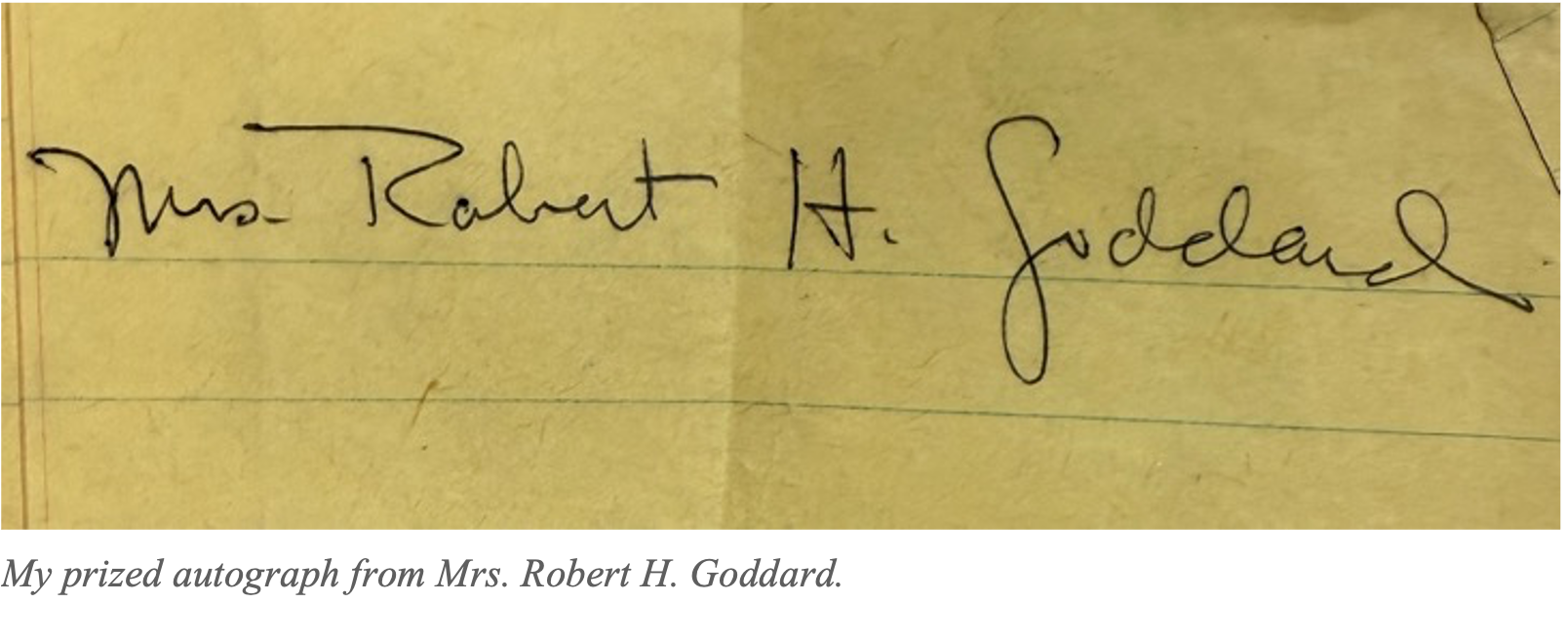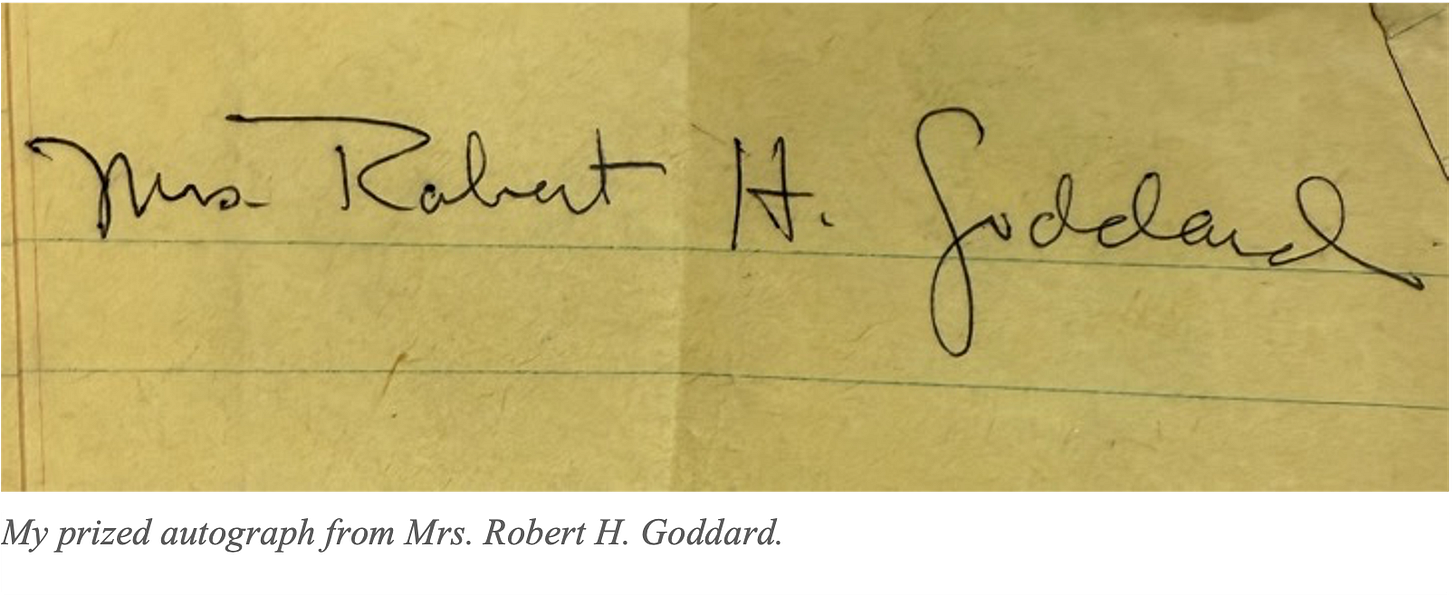 We all claimed some of the credit for building that telescope because all of us spent time hand-grinding the blank under Bill’s watchful eyes. But make no mistake: it was Bill who built that thing. He ground and ground and ground, week after week after week, starting with a coarse abrasive grit and grinding pommel, then onto a finer grit, and then finer still, until he was working with red polishing rouge at the end. I remember his pink-stained fingers at school. School: it was so fitting that we attended the brand-new Robert H. Goddard Junior High School in Midland, Texas, complete with rockets mounted on stands out front. Goddard, who invented the modern liquid-fuel rocket, was long dead, but his wife came to visit the school not long after it opened. I still have her autograph.