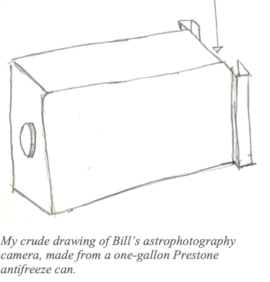 One of Bill’s goals was to do astrophotography. Keep in mind that this was 1968, and photography wasn’t what it is today. There was no such thing as a digital camera (mainly because there was no such thing yet, really, as digital anything), and there was no way to mount a standard camera on a telescope. So, Bill improvised in an extraordinary way. He took a one-gallon metal Prestone antifreeze can and cut the top off. He then flocked the inside of the can with a very dark, matte black paint to eliminate reflections. In the middle of the bottom of the can he cut a two-inch hole, and there he mounted a T-connector, which would allow him to attach it to the eyepiece holder of the telescope.