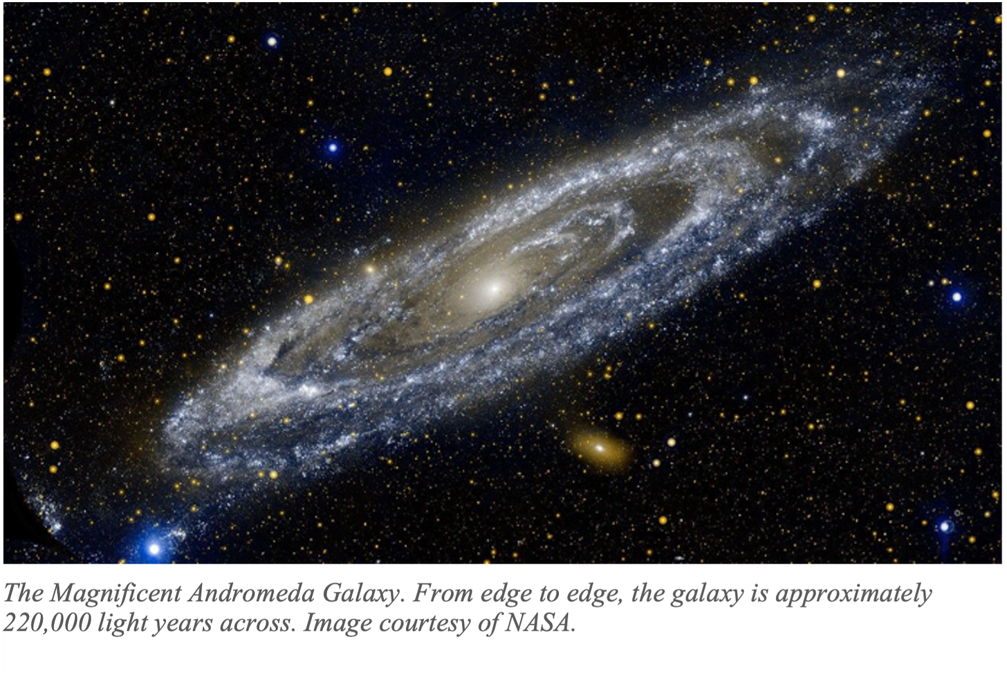 These things are also big—far bigger than we’re capable of imagining, as are the distances between them, which is why I said earlier that a telescope is a fully functional Time Machine. Andromeda, for example, is 220,000 light years across. You need a wide-angle eyepiece to look at it through a telescope. For context, consider this. The speed of light is a known constant—it never changes. Light travels at 186,000 miles per second, or just over 671 million miles per hour. Think orbiting Earth’s equator 7-1/2 times every second. That means that in one year, light travels 5.88 trillion miles. We call that a light year. It’s not a measure of time; it’s a measure of distance. To fly from one end of Andromeda to the other would take 220,000 years, at 186,000 miles per second. Pack a lunch.