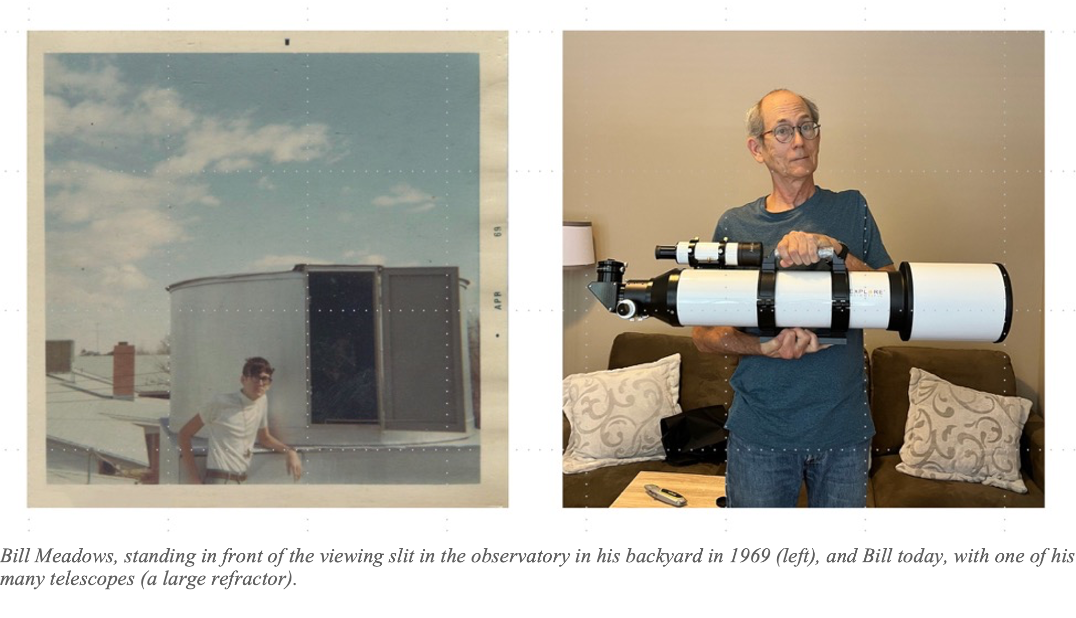 Somewhere around 1967, Bill decided that something was missing in his backyard. Not a tomato garden, or a jungle gym, or a trampoline; not a picnic table, or a barbecue grill, or a weight set. No, this 13-year-old decided that what was missing, what would really round the place out, was an observatory. His Dad agreed, and they built one. We all helped a little bit here and there, but this thing was Bill’s baby. It looked like half of a shoebox with a giant tuna can sitting on top, and the whole thing sat at roofline level on top of four pieces of drilling pipe punched into bedrock. Coming up through a hole in the center of the floor was a fifth piece of pipe which ultimately became the telescope mount, isolated from the observatory structure so that our walking about didn’t vibrate the telescope when it was focused on whatever it was focused on. The top and side of the tuna can had a two-foot-wide slit that could be opened for viewing. Many were the nights that we had sleepovers at Bill’s house, curled up and freezing in the observatory as we focused the telescope on distant celestial objects, things Bill could casually name and describe from memory, having seen them many, many times with whatever telescope he used before he built the big one.